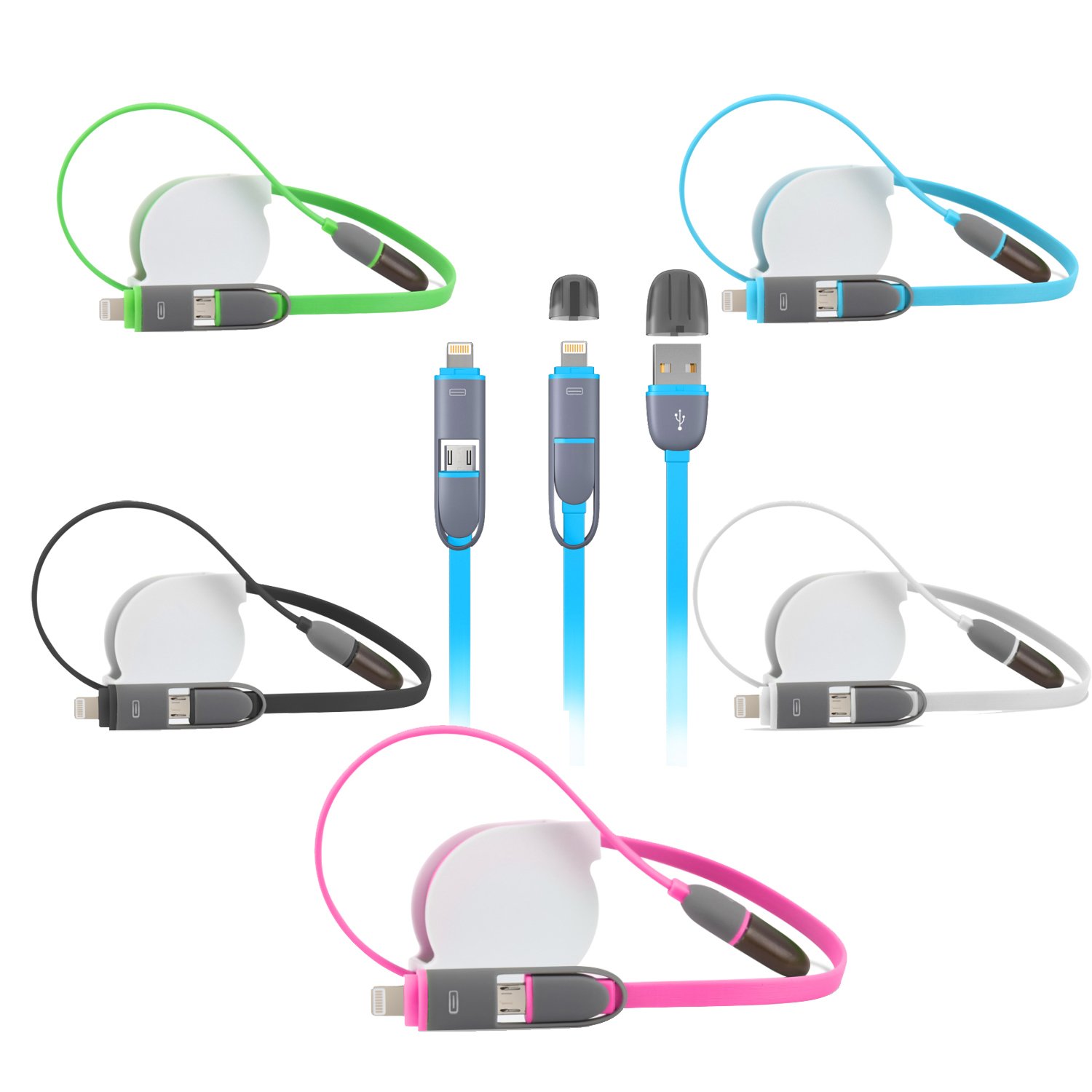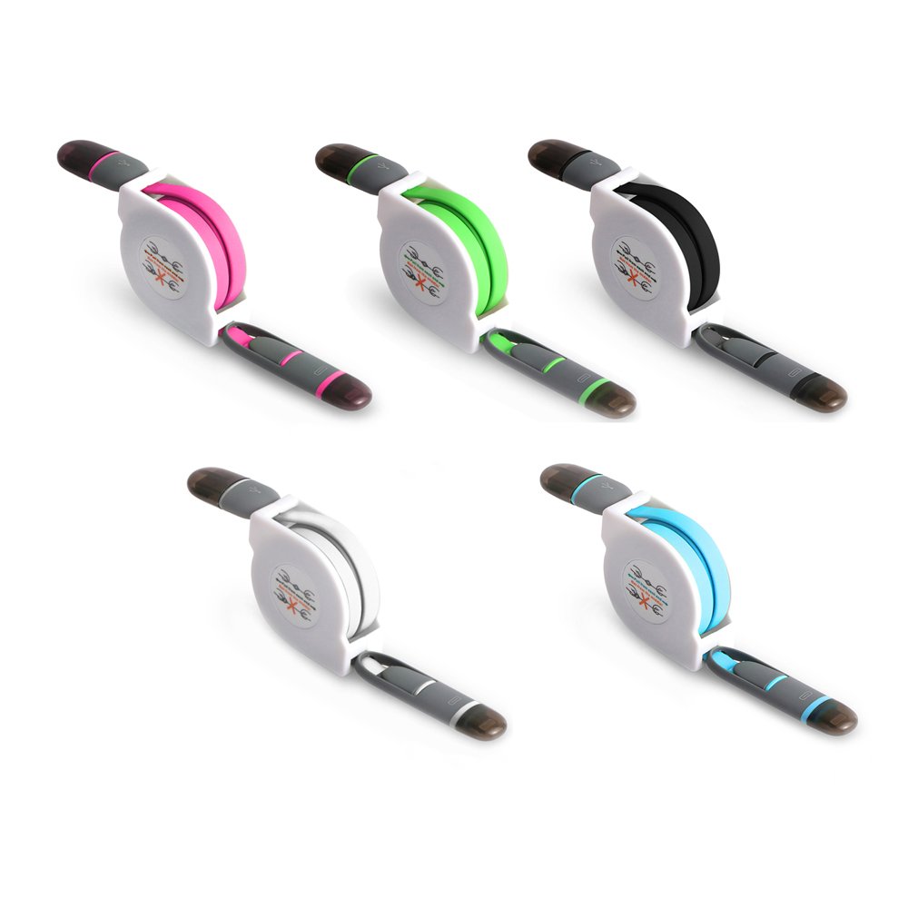 5 Pack of 3FT Retractable Cables (Green↔?Blue↔?Pink↔?Black↔?White)"
