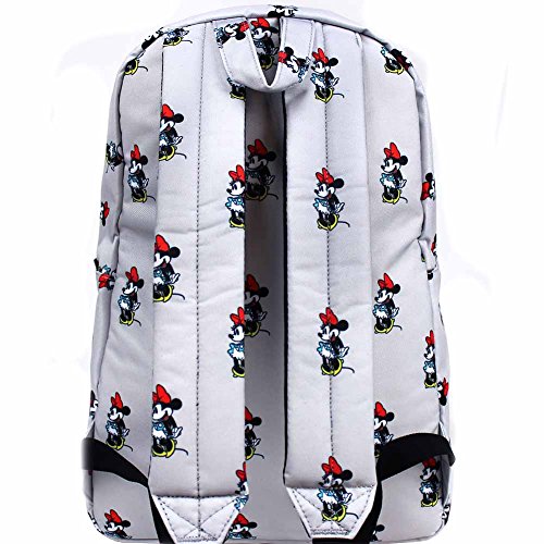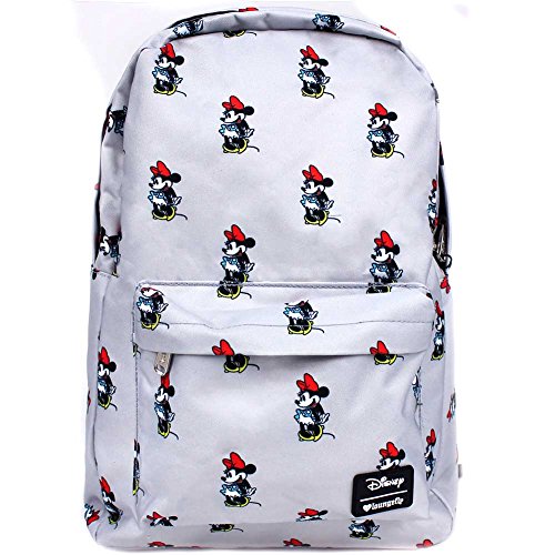 Take a look at your fave Disney characters like you've never seen them before in a new collection of super cute AOP backpacks from Loungefly. This fun Minnie AOP festival backpack from features a grey Nylon base with all-over Minnie graphic print, front zippered pocket, dual reinforced padded shoulder straps, fully lined interior with laptop pocket, and top zip closure.Feature