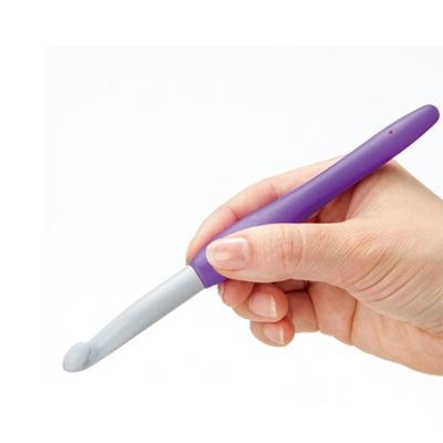 針先は、すべりの良い樹脂を使っています。軽いので、手に負担がかかりにくいです。針先から糸がはずれにくく、目を拾ったり、糸を引き抜きやすい針先形状です。手になじむソフトな素材と立体的なカーブで作られたグリップは、自然と指先にフィットし、持ちやすく疲れにくい設計になっています。 |