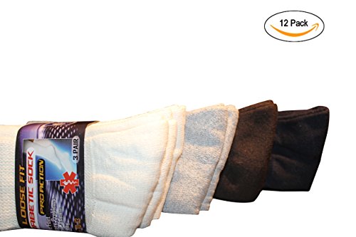 Studio : FAM TEXTILE INC Publisher : FAM TEXTILE INC Binding : Health and Beauty Product Description Fabric: 85% Cotton, 15% Polyester, 0.5% Elastic. Tops easily stretch over ankles and bounce back into shape. loose fitting tops stretch over ankle for ease of dressing. Tops bounce back for a comfort fit without binding the leg. Allows for better blood circulation, so important for diabetics and people with circulatory problems or neuropathy. Note: for people with such severe edema that shoes are uncomfortable , buyer may find that the next size up might be indicated. (available in other listings in sock size 9-11 and 10-13)sock size 10-13, typically fits shoe sizes men 7 - 11 economical - keep your loved one supplied with diabetic socks at a low price. For best fit, order the sock size that you usually buy at the store. 0
