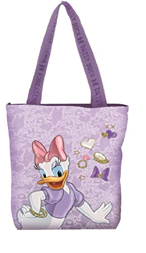This beautiful Disney Daisy Duck shopper bag is in a lovely lilac colour with a diamante encrusted Daisy Duck decal on the front, the bag measures 35cm (14") X 32cm (12.5") X 10cm (4"). The bag has a zip closure at the top and is satin lined inside. This is a fully licensed Disney product and is top quality.Feature