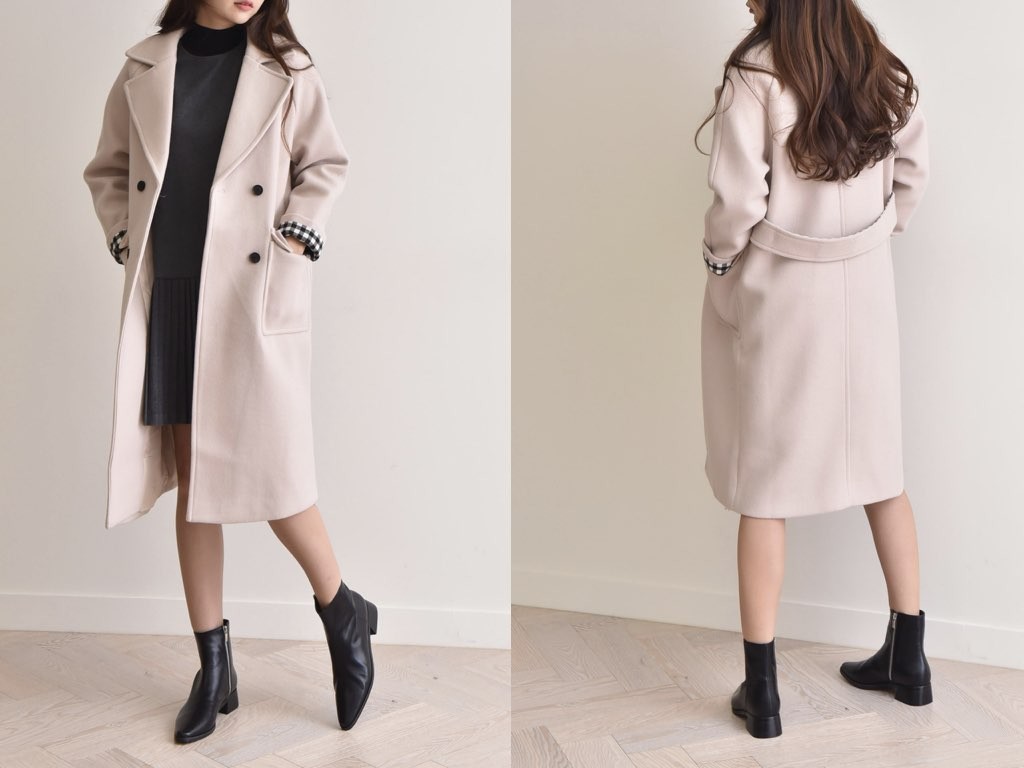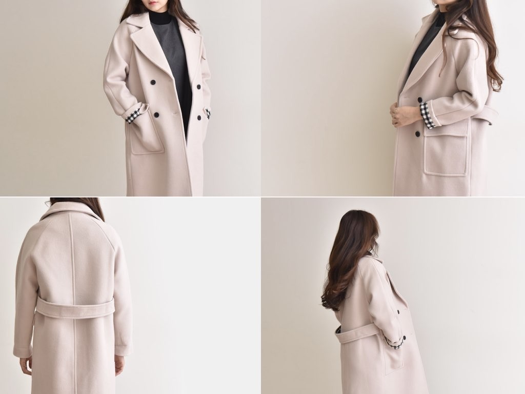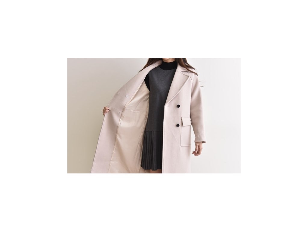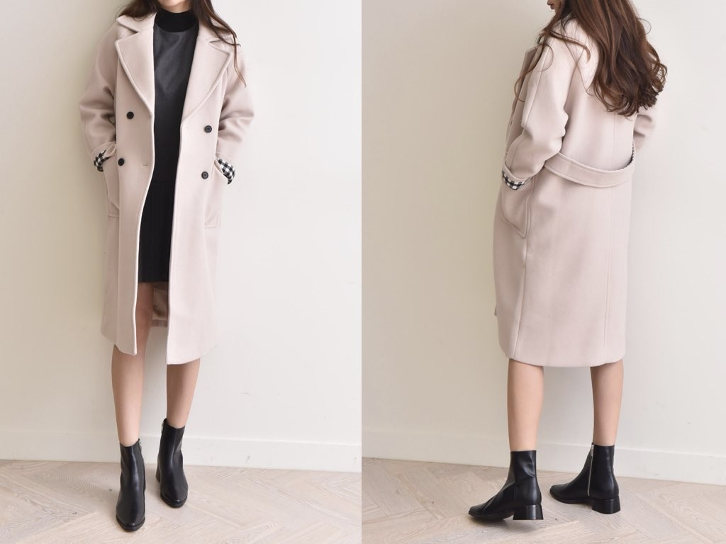ダブルのチェスター ロングコートです。さらりと着流せる長め丈です。これ一枚で旬な着こなしが実現しますね。きれいめスタイル、通勤スタイルにも、とてもマッチしますね。裏地は千鳥模様になっており、写真のように折り返してきても可愛いですね。商品は、とても丁寧なつくりとなっています。1.基本情報色:2色展開(クリーム/ブラウン)サイズ:Free素材:ウール混製造国:Korea2.サイズ情報肩幅:ナグランデザイン身幅(胸断面):53cm 腕の長さ:66cm 着丈(前):106cm (サイズは計る方法に応じて±2〜3cmの誤差があります。ご了承お願い致します)モデル着用サイズ:F※着用モデル(163cm、体重47kg、足のサイズ24.5cm)3.その他の情報厚み:中間透け感:なし伸縮性:なし裏地:あり洗濯方法:ドライ(クリーニング)[注意事項]お取り寄せ商品は、海外より仕入れるため納品まで約10日前後いただきます。また店舗でも販売しており、在庫切れになる場合もございます。ご了承お願い致します。