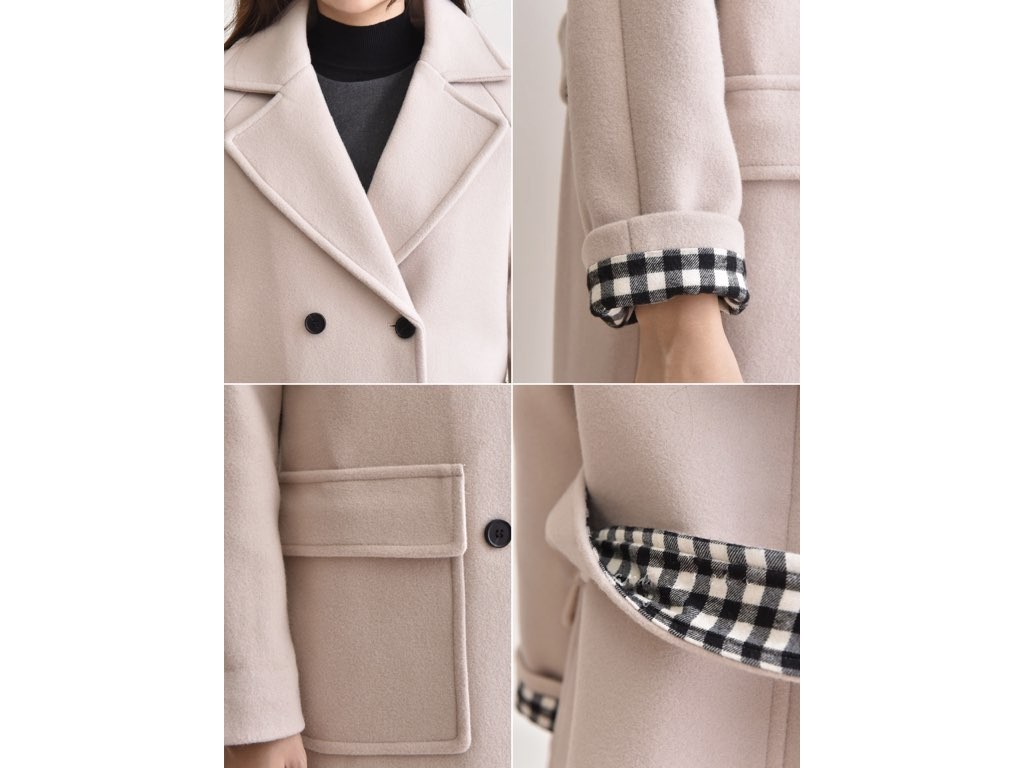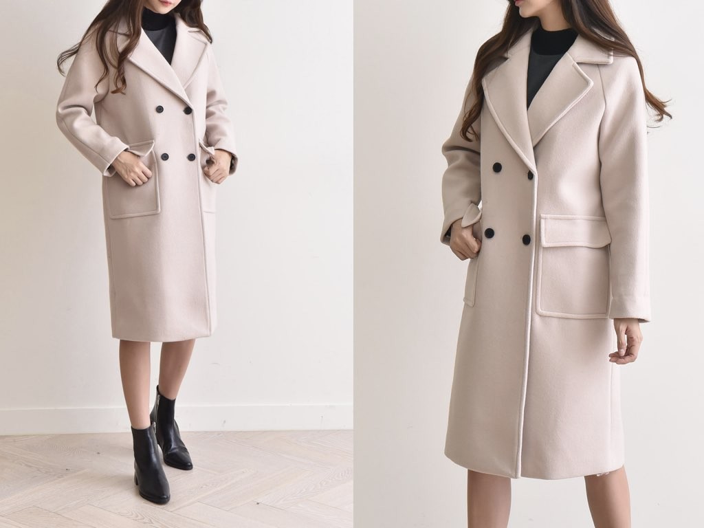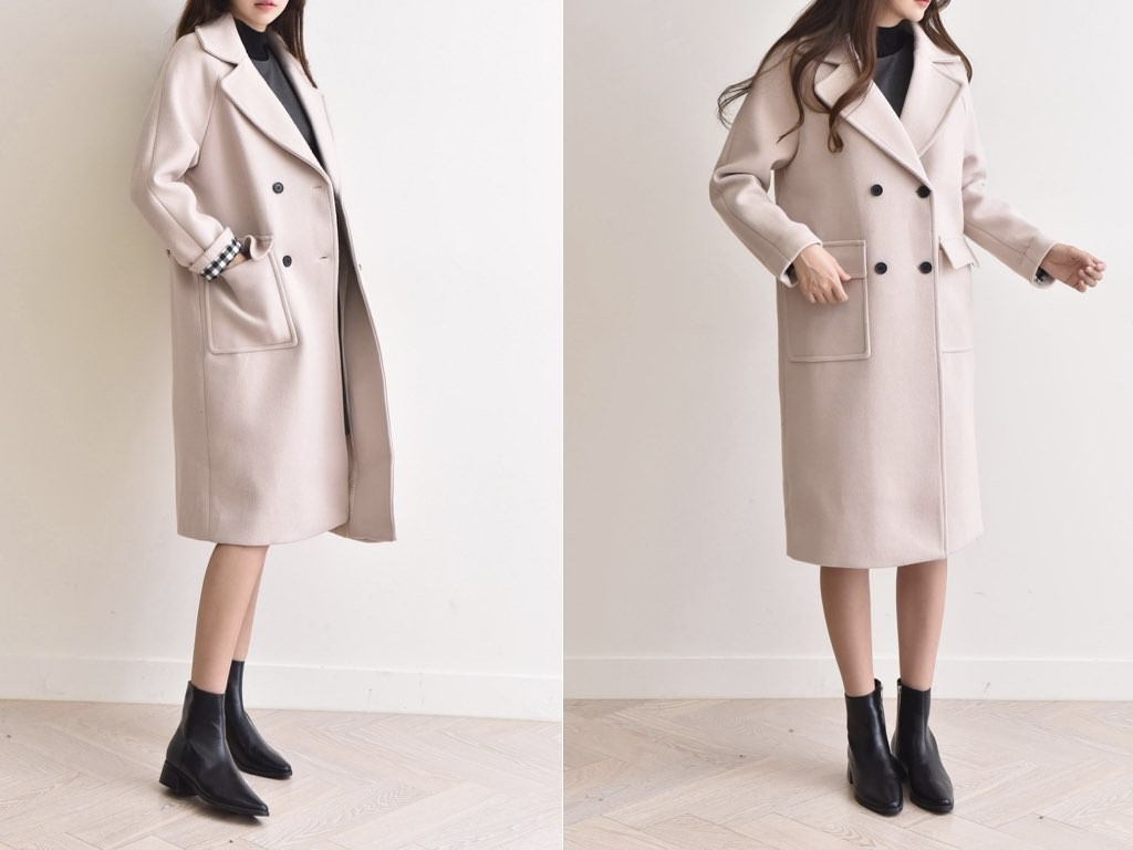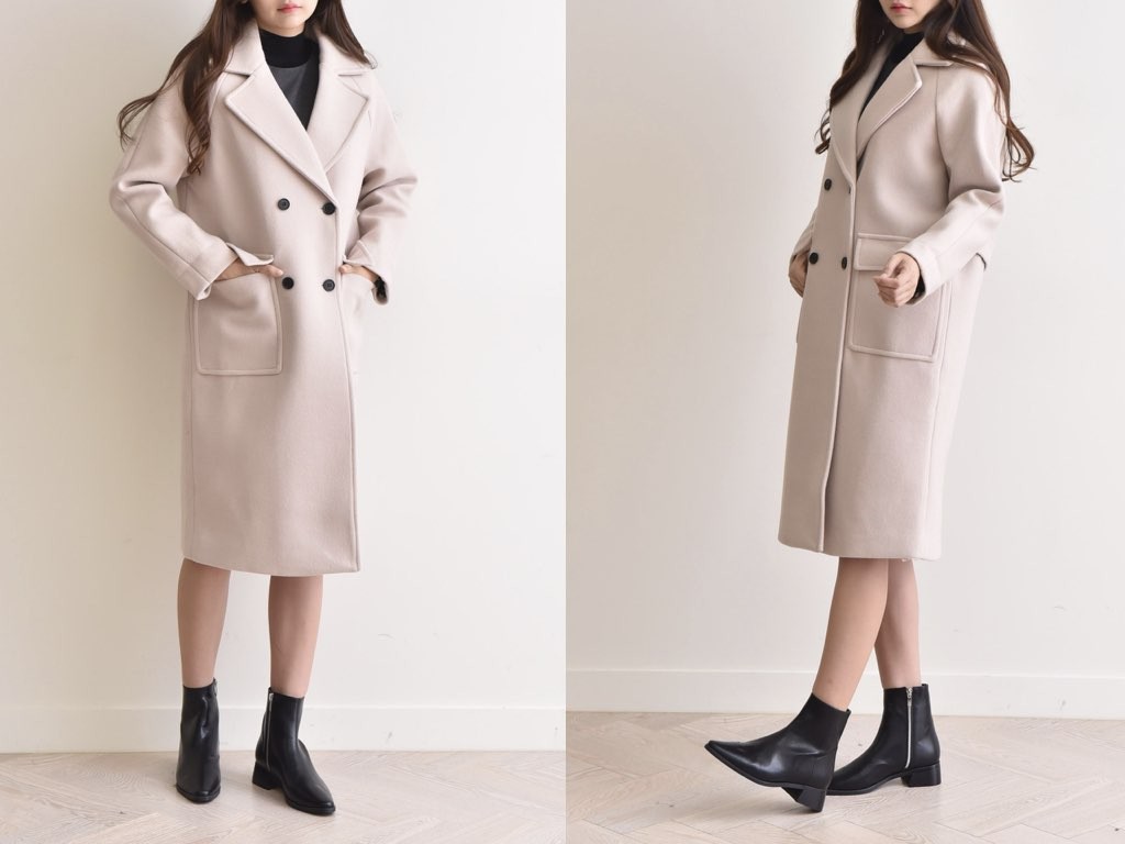ダブルのチェスター ロングコートです。さらりと着流せる長め丈です。これ一枚で旬な着こなしが実現しますね。きれいめスタイル、通勤スタイルにも、とてもマッチしますね。裏地は千鳥模様になっており、写真のように折り返してきても可愛いですね。商品は、とても丁寧なつくりとなっています。1.基本情報色:2色展開(クリーム/ブラウン)サイズ:Free素材:ウール混製造国:Korea2.サイズ情報肩幅:ナグランデザイン身幅(胸断面):53cm 腕の長さ:66cm 着丈(前):106cm (サイズは計る方法に応じて±2〜3cmの誤差があります。ご了承お願い致します)モデル着用サイズ:F※着用モデル(163cm、体重47kg、足のサイズ24.5cm)3.その他の情報厚み:中間透け感:なし伸縮性:なし裏地:あり洗濯方法:ドライ(クリーニング)[注意事項]お取り寄せ商品は、海外より仕入れるため納品まで約10日前後いただきます。また店舗でも販売しており、在庫切れになる場合もございます。ご了承お願い致します。