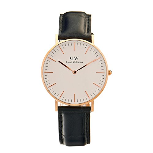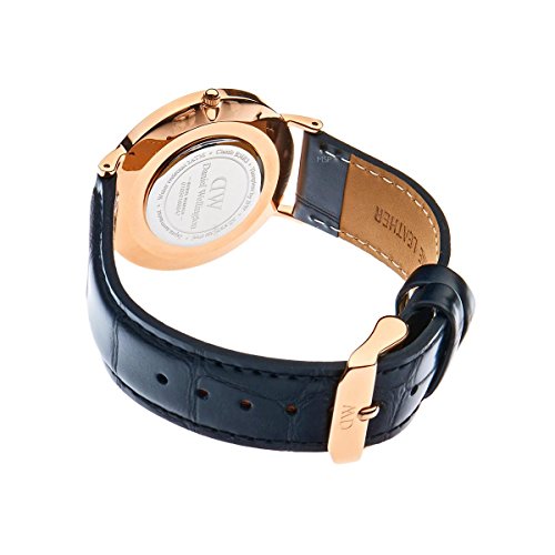 Rose gold-tone stainless steel case with a black leather strap. Fixed rose gold-tone bezel. White dial with rose gold-tone hands and index hour markers. Minute markers around the outer rim. Dial Type: Analog. Quartz movement. Scratch resistant mineral crystal. Pull / push crown. Solid case back. Case size: 38 mm. Case thickness: 6 mm. Round case shape. Band width: 18 mm. Tang clasp. Water resistant at 30 meters / 100 feet. Functions: hour, minute,. Casual watch style. Item Variations: DW00100041. Daniel Wellington Classic Reading Mens Watch 0513DW.Feature