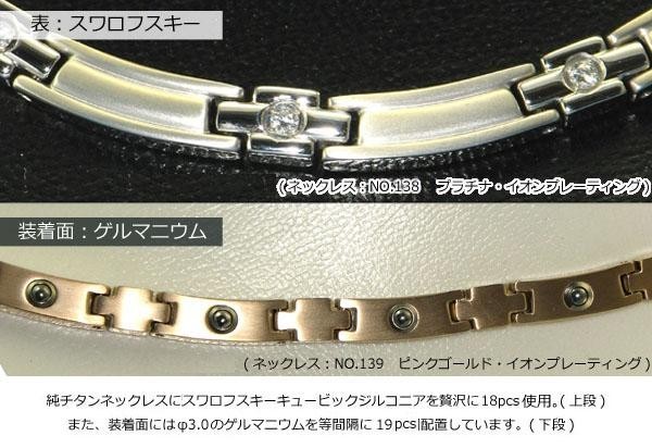 | イオンプレーティング(IPメッキ)を施したミラー仕上げの純チタンネックレスに、スワロフスキーキュービックジルコニアを18pcsと、99.99%の高純度ゲルマニウムを19pcs使用しました。様々なコーディネートに合わせやすいシンプルなデザインです♪ |