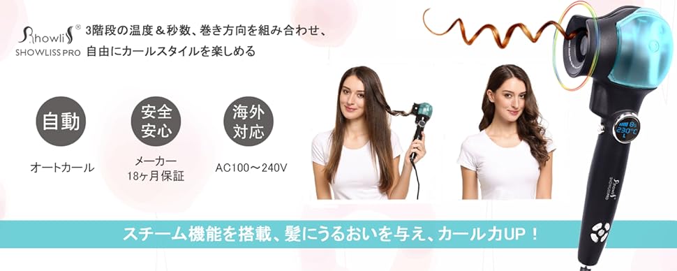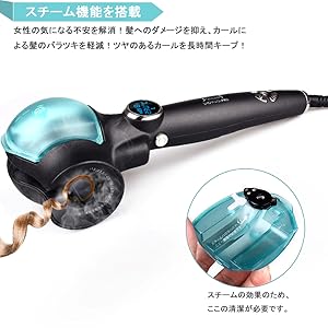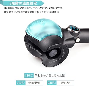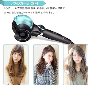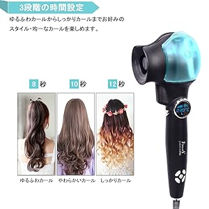 ・温度設定 3段階の温度設定(180℃、210℃、230℃)が可能で、やわらかい髪、染めた髪や中等髪質 や硬い髪などの髪質に合わせたセットが可能に。 新技術を採用しており、低温状態からも素早く高温に戻すことが出来ます。それに、30分自動電源オフ機能も搭載で消し忘れでも安心です。 | ・時間設定 3段階の時間設定(8秒、10秒、12秒)が可能で、ゆるふわカールからしっかりカールまで、お好みのスタイル・均一なカールを楽しめます。 秒数設定時間後にカール完了をビープ音で知らせてくれますので、巻過ぎや高温で髪を痛めることがありません。 | ・カール方向設定 3つのカール方向設定(左巻き、右巻き、MIX巻き)が可能で、好みに合わせたカールヘアが簡単 に作れます。サロンで巻くのと同じようなきれいなカールに感動。扱いにくい後ろの髪も、簡単に巻けます。 |