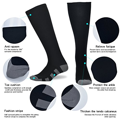 - PHYSICIAN DESIGNED HIGHEST QUALITY KNEE HIGH COMPRESSION SOCKS – Our graduated compression socks (20-30 mmHg) are recommended by doctors and preferred by trainers. The reinforced/cushioned heel and toe support provide unmatched comfort. We carefully designed and manufactured our compression socks to provide premium support, comfort, and relief without compromising your mobility. Form fitting, lightweight, and breathable fabric features maintain joint stability regardless of activity.