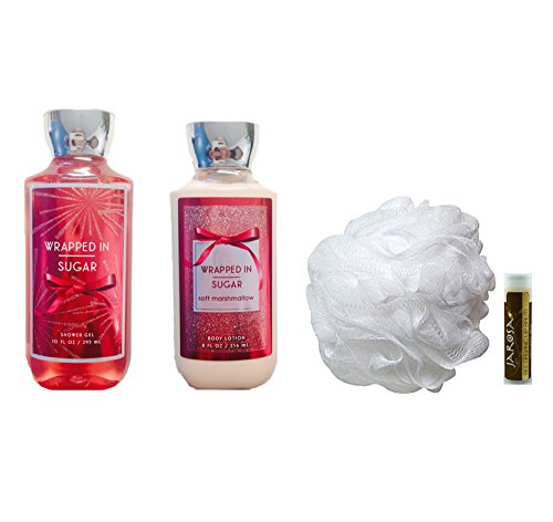 -. Feature : WRAPPED IN SUGAR SOFT MARSHMALLOW BODY LOTION: Infused with Shea Butter and their exclusive Daily Moisture Complex, their enhanced lotion contains more of what skin loves, leaving it feeling incredibly soft, smooth and nourished. Fortified with nutrient-rich ingredients like protective Vitamin E and conditioning Vitamin B5, their fast-absorbing, non-greasy formula delivers 16 hours of continuous moisture. Size: 8 fl.oz/236 mL / WRAPPED IN SUGAR SOFT MARSHMALLOW SHOWER GEL: Wash your way to softer, cleaner skin with a rich, bubbly lather bursting with fragrance. Moisturizing Aloe and Vitamin E combine with skin-loving Shea Butter in their most irresistible, beautifully fragranced formula! Size: 10 fl.oz/295 mL / MESH SHOWER PUFF/SPONGE: This gentle sponge has a convenient strap & is the perfect accessory for a luxurious cleansing experience. The super soft texture creates a rich lather, use less gel & feel more pampered! WRAP YOURSELF IN A WARM BLEND of coconut martini, marshmallow musk, soft amber & warm woods. / FINISH WITH THE WORLD'S BEST LIP BALM, 100% natural and USDA certified organic by Oregon Tilth for your peace of mind. Great for protecting lips and highly effective as a moisturizer. Use for dry, chapped lips, to moisturize before applying lipstick or as a gloss for over lip stain. Great for sensitive lips. / YOU WILL RECEIVE: 1 - 8 fl.oz/236 mL Wrapped in Sugar Soft Marshmallow Body Lotion, 1 - 10 fl.oz/295 mL Wrapped in Sugar Soft Marshmallow Shower Gel, 1 - White Shower Puff & 1 - Jarosa Bee Organic Choocolate Bliss Lip Balm in your purchase.