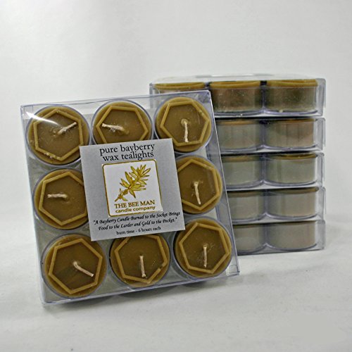 Studio : The Bee Man Candle Company Publisher : The Bee Man Candle Company Binding : Kitchen Product Description A clear plastic gift pack of 9 all natural hand poured pure Bayberry tealight candles made by The Bee Man Candle Company. These tealights are made from pure bayberry wax blended with a touch of pure beeswax to create a perfect, all natural bayberry tealight candle. These tealights do not contain added artificial scent and lead-free cotton wicks are also used. The candle is unscented, but has the naturally mild bayberry scent from the bayberry wax. The all natural scent is subtle compared to the sometimes heavily artificially scented candles that many are used to. If you want a strong scented candle these natural bayberry tealight candles will not work for you, 0