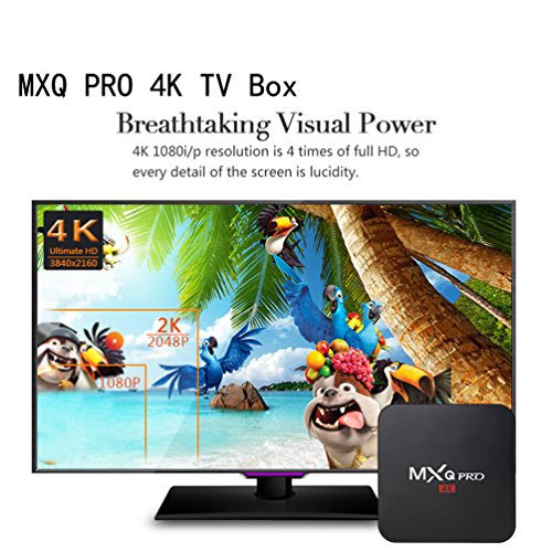 -. Feature : MXQ Pro Support 4K Ultimate HD vedio hardware decoding. With preinstalled Google Play Store and other apps, you can enjoy smooth multi-tasking, game playing or movie viewing. / MXQ Pro Bandwidth saving Lifting speed:H.265 hardware decoding can save 50% bandwith resources,let you watch the 4K movie smoothly.4K 1080i/P resolution is 4 times of full HD, so every detail of the screen is lucidity. / Built for Entertainment, Home Theater, Business Meeting, Office Work, etc,to share with friends, Your movies, TV Shows, Music all at your fingertips. Online forums, tutorials, and videos are plenty. You want a TV media player to do exactly what you need and something less will just ruin the whole experience. / MXQ PRO TV BOX has 4 High speed USB ports(2.0),support U DISK and USB HDD. / EASY CONNECTION AND SIMPLE OPERATION: You can go directly to let your TV and MXQ PRO Box are connected through a HD cable. Four 2.0 USB ports, connect with mouse and keyboard to help you operate more convenient. Infrared Remote control let you enjoy your wonderful life which the wireless brings to you .