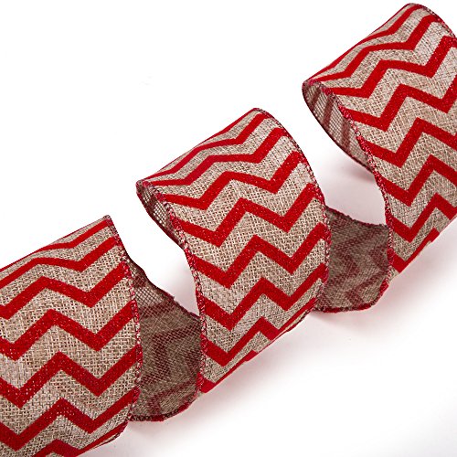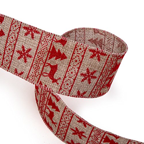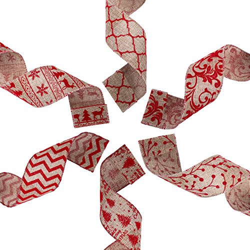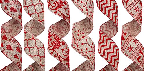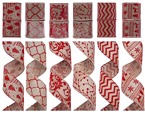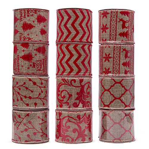 SANNO Wired Burlap Decorations Ribbon 12 Rolls Assorted Rustic Patterns Classic Fabric Ribbons Crafters Ornaments 36 Yards (2.5"Width x 3Yard Each) - Red
