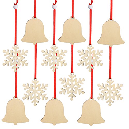 Bememo 12 Pieces Wooden Snowflake Cutouts and Wooden Christmas Bell Ornaments with Hanging Strings for Christmas, Festival, Decoration, Embellishments