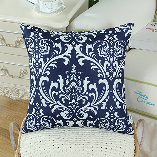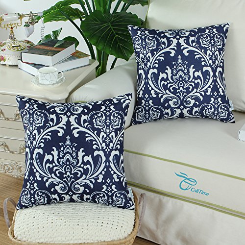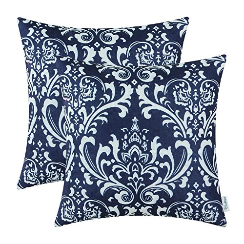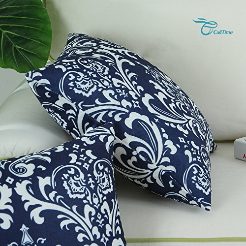 Pack of 2 CaliTime Throw Pillow Covers 18 X 18 Inches, Vintage Damask Floral, Navy Blue