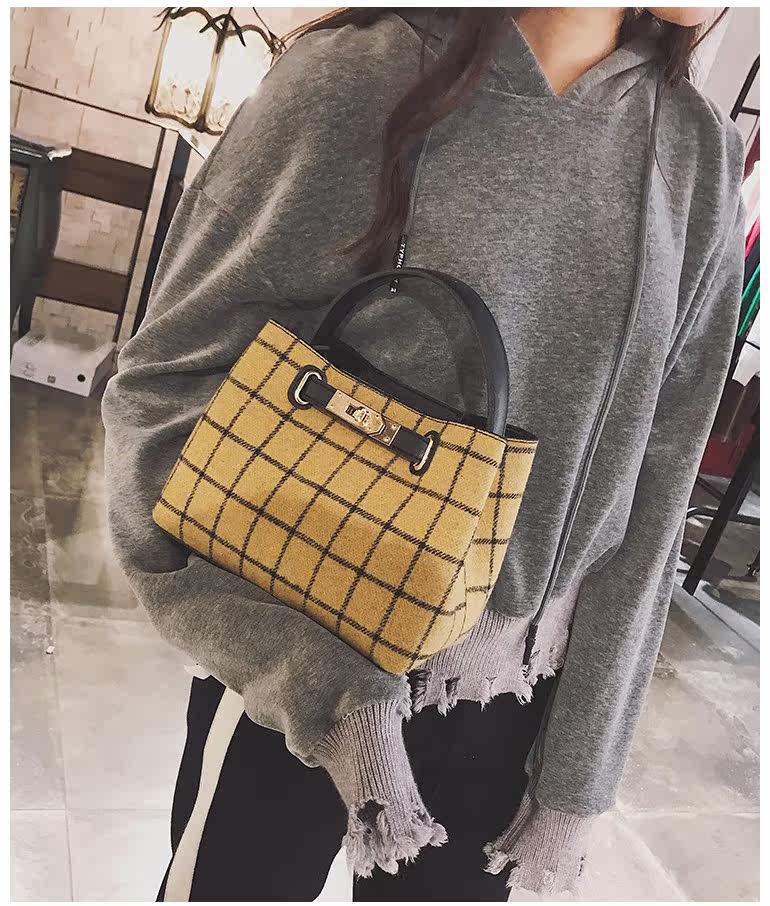 时尚撞色水桶包女冬季新款毛呢条纹手提包休闲百搭单肩斜挎包