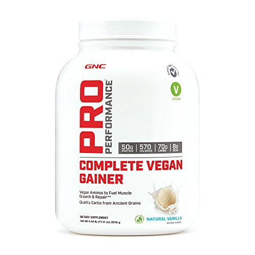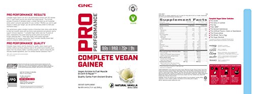-. Binding : Health and Beauty -. Brand : GNC -. EAN : 0048107178703 -. Feature : Vegan Aminos To Fuel Muscle Growth & Repair / Quality Carbs From Ancient Grains / Pro Performance Results / Complete Vegan Gainer Is An All-In-One Performance Formula With 550 Calories From 17 Plant-Based Sources And Whole-Food-Based Blends.This Formula Provides 50 Grams Of Complete Protein, A Protein That Gives You All 9 Essential Amino Acids In Amounts ApproP.R.Iate For Your Nutrition.Whether You Want To Gain Muscle Or Satisfy Your Hunger, You Can Use This Delicious Protein To Meet Your Nutritional Needs. / This Performance Gainer Provides 9 Grams Of Branched Chain Amino Acids (Bcc) To Help Fuel Muscles, Along With Key Amino Acids Glutamine And Glutamic Acid To Support Immune Response.Complete Vegan Gainer Also Has 70 Grams Of Clean, Maltodextrin-Free Carbs Featuring Ancient Grains And 8 Grams Of Hunger-Satisfying Fiber.These High-Quality Carbs Support Glycogen Replenishment For Energy Regeneration. And It Includes Clinically Proven Beet Extract To Enhance Athletic Performance. -. Label : GNC -. Manufacturer : GNC -. MPN : 369877 -. PackageQuantity : 1 -. PartNumber : 369877 -. ProductGroup : Health and Beauty -. ProductTypeName : HEALTH_PERSONAL_CARE -. Publisher : GNC -. Size : 4.5 lb(s) -. Studio : GNC -. Title : GNC Pro Performance Complete Vegan Gainer - Natural Vanilla -. UPC : 048107178703