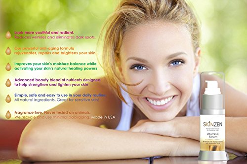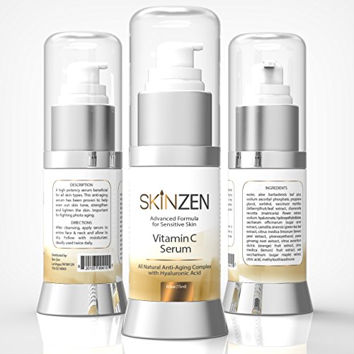 -. Feature : MORE GENTLE than 20% Vitamin C serums - does not irritate your skin. Makes fine lines less noticeable and your complexion brighter. Say goodbye to that scaly, itchy, burning feeling. This calming, restorative blend of Vitamin C and hyaluronic acid also shrinks pores and help remove bumps. Leaves your skin SMOOTH and SOFTER. Customers tell us it reduces blemishes and makes your foundation go on smoother. Look younger and more vibrant. / WORKS GREAT with your moisturizer - EASY TO USE in your daily routine. Our ELEGANT pump style bottle saves hassle of messier dropper style bottles that waste a lot of your serum on towels or wash cloths instead of where it belongs-on your skin! / REDUCES WRINKLES. Helps MINIMIZE DARK SPOTS. EXCELLENT RESULTS at a fraction of luxury brand P.R.Ices. Also works well in neck and decollete area too! Women in dry climates also use it on their feet to look better when wearing sandals. / FRAGRANCE FREE! Made in the USA. We are Planet Friendly and use as little packaging as possible. Our facility recycles and our products are never tested on animals! / Give Skin Zen 30 days and it'll give you a FRESHER YOUNGER LOOKING face... naturally! If you're not absolutely thrilled with your results then we insist on giving you a full refund ASAP. So ORDER TODAY!