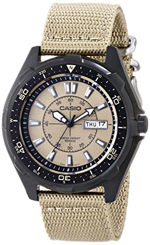 -. Binding : Watch -. Brand : Casio -. Color : Gold -. Department : mens -. EAN : 0339368178572 -. Feature : Round black stainless steel case and bi-directional rotating bezel / Black and tan dial with day and date display at 3 o'clock / Luminous hands and index markers / Beige nylon strap with buckle closure / Water resistant to 330 feet (100 M): suitable for snorkeling, as well as swimming, but not diving -. Label : Casio -. Manufacturer : Casio -. Model : AMW110-9AV -. MPN : AMW110-9AV -. PackageQuantity : 1 -. PartNumber : AMW110-9AV -. ProductGroup : Watch -. ProductTypeName : WATCH -. Publisher : Casio -. ReleaseDate : 2013-09-06 -. Studio : Casio -. Title : Casio Men's AMW110-9AV Classic Analog Tan Nylon Strap Watch -. UPC : 339368178572 -. Warranty : Comes with Manufacturer Warranty.