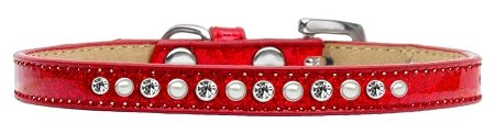 Studio : Mirage Pet Products Publisher : Mirage Pet Products Binding : Misc. Product Description Mirage Pet Products Pearl and Clear Crystal Red Puppy Dog Ice Cream Collar, Size 16. 3/8" wide collar adorned with 1 row of pearls and rhinestones along with a rhinestone buckle. Fits a neck size from 12-14". Made in the USA. 0