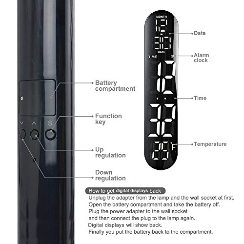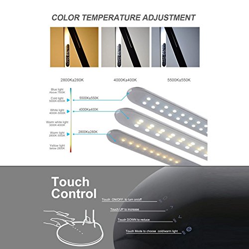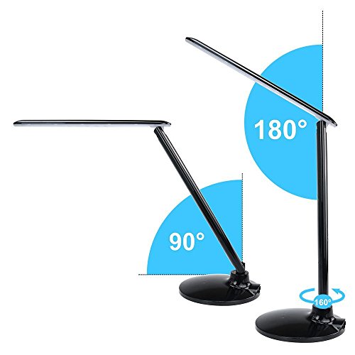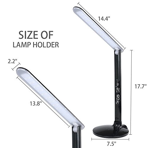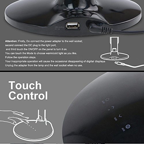 - Feature : Multifunctional LED Desk Lamp: Sleek design with Date & Time & Calendar & Degrees Fahrenheit LCD Display, setting alarm clock and charging your mobile devices via USB port. / Dimmable LED Lamp: Non-step dimming touch switch. 3 lighting modes: warm white, natural white and cold white with 5 brightness levels controlled by UP and Down touch switches. / Foldable LED Lamp: Three angles adjustment: 180°landscape angle rotating on lamp folder, 180°horizontal rotating and 90°landscape rotating on lamp base part. / Eye-protection LED Lamp: Soft and non-flickering light for eye protection with an original real color picture by v-cut, no mercury & Tungsten, no UV, no IR, no lead pollution, no thermal radiation and noise. / Touch LED Lamp: Just a finger of touch to control the LED lamp easily. Easy to set the time, date, calendar and alarm clock by pressing the buttons at the back of bar.