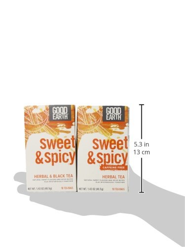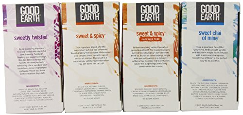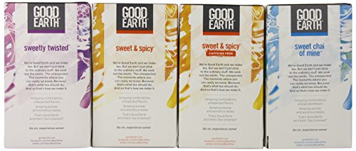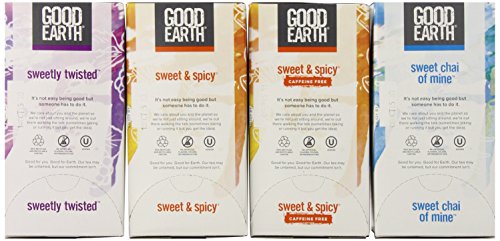 -. Binding : Grocery -. Brand : Good Earth -. EAN : 0027018102960 -. Feature : Flavors in variety pack: sweet and spicy caffeine free, sweet and spicy, sweet chai of mine and sweetly twisted / Delicious black tea / Great alternative to coffee / Contains 4 boxes, each box containing 18 tea bags / Includes one 18 count box each of Good Earth Sweet & Spicy, Sweet & Spicy Caffeine Free, Sweetly Twisted, and Sweet Chai of Mine teas (72 total tea bags) / A great way to add some variety to the hot beverages you enjoy at home / Makes a perfect gift for the tea-lover in your family / No artificial flavors, colors or preservatives / Kosher certified and gluten free -. IsAdultProduct : 0 -. Label : Good Earth -. Manufacturer : Good Earth -. NumberOfItems : 1 -. PackageQuantity : 1 -. ProductGroup : Grocery -. ProductTypeName : GROCERY -. PublicationDate : 2013-12-08 -. Publisher : Good Earth -. ReleaseDate : 2013-12-08 -. Studio : Good Earth -. Title : Good Earth Black Tea Variety Pack, 4 Boxes, each with 18 bags -. UPC : 027018102960