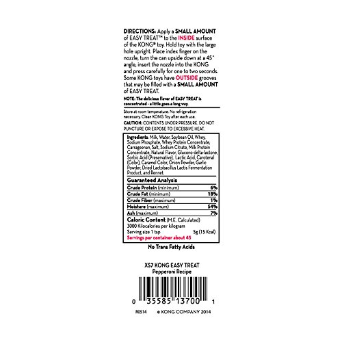 -. Binding : Misc. -. Brand : KONG -. Feature : Irresistible and delicious pepperoni flavor to engage and delight dogs / Easy to dispense as a convenient no mess stuffing solution / Great for stuffing into KONG Classic and rubber toys for extended play / Made in the USA / Available in one size: 8 oz. -. Label : KONG -. Manufacturer : KONG -. MPN : 292737-PHIL-PAR -. PackageQuantity : 1 -. PartNumber : 292737-PHIL-PAR -. ProductGroup : Pet Products -. ProductTypeName : PET_SUPPLIES -. Publisher : KONG -. Studio : KONG -. Title : KONG Stuff'N Pepperoni Recipe