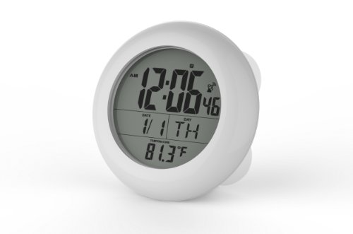 Atomic LCD Bathroom Shower Clock Displays Time, Date, Week and Temperature with 4 Suction Cups, Hanging Hole and Table Stand (White Color)