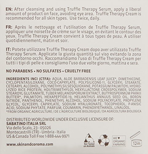 -. Binding : Health and Beauty -. Brand : Skin and Co Roma -. Department : womens -. EAN : 0888265602012 -. Feature : Restores skin radiance and harmony / Brightens and nourishes upon application / Tightens skin / Reduces fine lines and wrinkles / Minimizes the appearance of pores -. IsAdultProduct : 0 -. Label : Skin and Co Roma -. Manufacturer : Skin and Co Roma -. Model : 60201 -. MPN : 60201 -. NumberOfItems : 1 -. PackageQuantity : 1 -. PartNumber : 60201 -. ProductGroup : Beauty -. ProductTypeName : BEAUTY -. PublicationDate : 2014-04-21 -. Publisher : Skin and Co Roma -. ReleaseDate : 2013-10-08 -. Size : 1 fl.oz/30 ml -. Studio : Skin and Co Roma -. Title : Skin and Co Roma Truffle Therapy Cream, 1 Fluid Ounce -. UPC : 888265602012