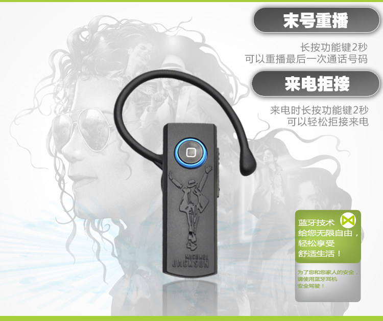 We all know that a Bluetooth headset is necessary when you are driving,it is convenient and safe for you to answer a call. Now, we will recommend you a stylish Michael Jackson Commemorative version wireless Bluetooth V3.0+EDR stereo headset, which adopts wireless Bluetooth technology, and can be paired with Bluetooth-enabled mobile phones and PC for listening to music, making phone calls and talk with your friends on Skype, QQ, MSN, etc. With easy to use and good sound quality, it is really a wonderful Original Bluetooth headset for choice.
