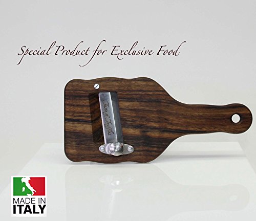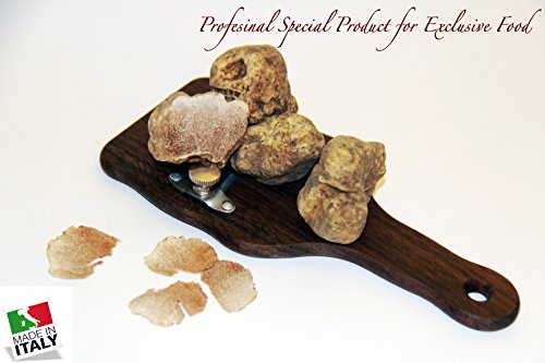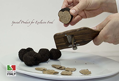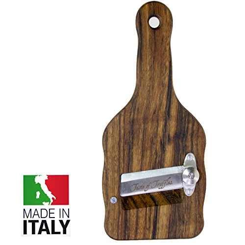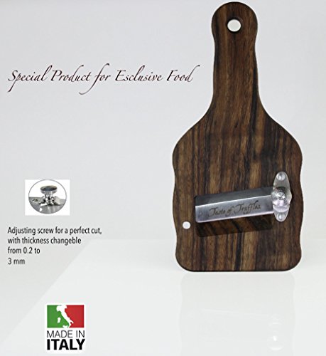 Studio : Taste of Truffles Publisher : Taste of Truffles Product Description TRUFFLE SLICERS/Shaver in Precious Olive Wood Stainless Steel blade, manufactured and sharpened with the best materials and the greatest care, and the high-quality adjusting screw allow to cut perfect slices, with thickness from 0,2 to 3 mm and without loss of food. Perfect also for Mushrooms, Vegetables, Cheese and Chocolate. Easy to clean. 0