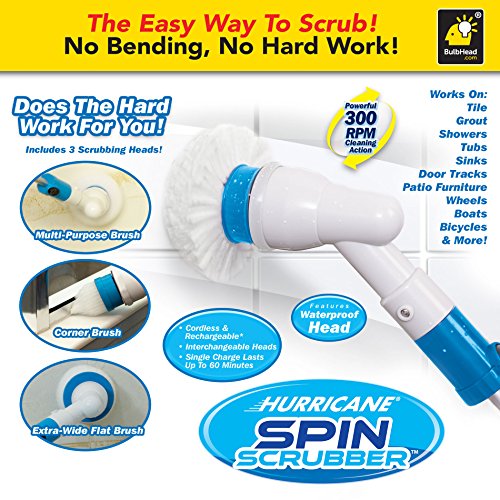 -. Binding : Health and Beauty -. Brand : Hurricane -. ProductGroup : Health and Beauty -. ProductTypeName : HEALTH_PERSONAL_CARE -. Title : Hurricane Spin Scrubber Cordless Rechargeable Power Scrubber by BulbHead