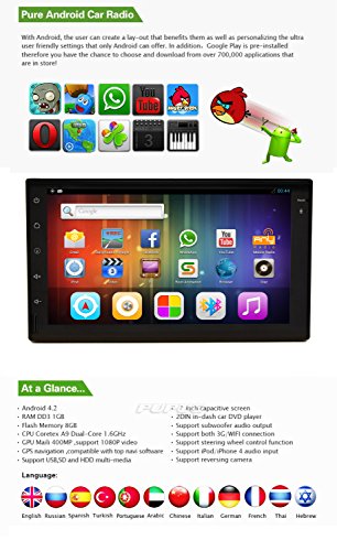 -. Feature : GPS Navigation Car Stereo:Bulit-in 3D GPS map for North America/Europe/Australia etc.support Google map online and you can update your map online.This GPS system will guide you to your destination accurately with voice broadcast.Dual Zone Function,you can make phone call with Bluetooth built-in microphone and play video or music while GPS navigation running. / Fresh Android 4.2 Operating System:High running speed with Dual Core CPU,you can download APP from Android market or installed in SD card in advance,and you can keep connected through MSN, Skype, Gmail, Twitter, Facebook, QQ, blogs etc,handle official issues urgently while parking.Rear Camera Function,you can observe everything behind your car for reversing safely with night vision and waterproof backup camera. / Internet Function,Wifi internet supported,you can surf internet in high speed with Wifi internet .WiFi Support,,3G Support WCDMA ,3G dongle or via phone as WiFi hot spot (3G dongle need additional payment).Steering wheel control function:you can operating you car stereo with your steering wheel safely without touching car radio audio. / Capacitive Touchscreen car video player,100% Capacitive touchscreen with 7color key background,3D rotating LCD Monitor touchscreen smooth sliding with no blind angle.Multi-touch TFT touchscreen for Android game and causal wallpaper change.Bulit- in Bluetooth with Microphone:you can enjoy streaming music and make hands-free phone calling while enjoy driving. / Multi Function car kit,Touch Screen, Steering Wheel Control, GPS navigation,RDS, DVR,SD/USB Support, Remote control,FM Transmitter, Subwoofer Output, 3D Interface, iPod, Built-in Bluetooth,car logo setting.AM/FM Radio player,Radio Response Bandwidth frequency,AM: 522 KHz-1620 KHz;FM: 87.5 MHz-108 MHz.Country:China,Europe,Eastern,Russia,USA1,USA2,Japan etc.
