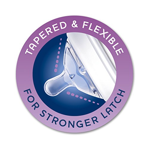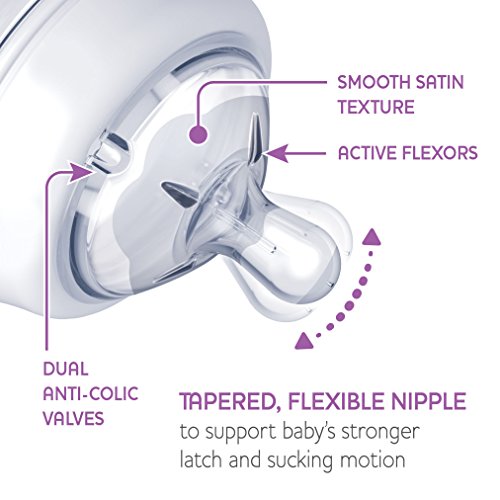Our straight nipple with faster flow rate and advanced dual anti-colic valves allow air inside the bottle to escape out of the sides of the nipple, which helps prevent air intake, gas and tummy upset. The nipple's soft-as-mom's-skin materials and slightly rounded base ensure a more comfortable fit in baby's mouth and encourage tighter lip support to help suit baby's growing appetite. Flexors at the base of the nipple allow the same natural sucking motion baby uses on the breast, while internal ridges help prevent nipple collapse.