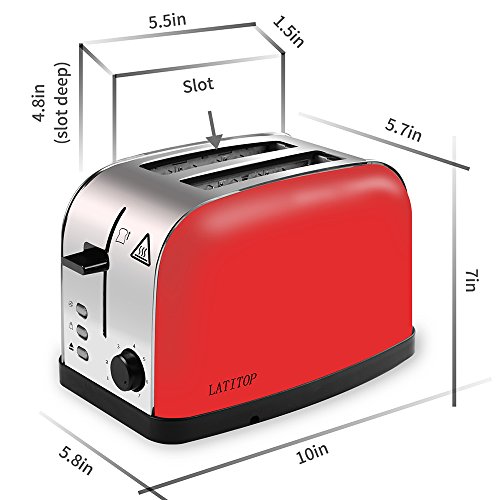 Product Description Specification ●Brand: LATITOP ●Material: Aluminum(grill part), Zinc(silver color part), and Stainless steel(Red part) ●Color: Red ●Slices: 2 slices ●Whole size: 10.5*6*6.5inch(L*W*H) ●Slot Size: 5.5* 1.5*4.8inch(L*W*H) ●Voltage: 120V ●Power: 850W ●Weight: 1.05kg