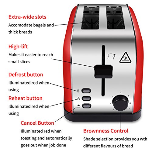 Multiple Functions: Toast: Toasts breads, bagels, English muffins and pop tarts Defrost: First defrost, then toast frozen bread Reheat: If you get interrupted, this feature lets you reheat the toast without destroying it. Cancel: Press this button to stops all toasting operation Extra Wide Slots: 1.5inch wide slot accommodates thick and thin foods Adjustable Heat/browning Settings: The toaster has a browning control knob that can be adjusted for the brownness degree of the breads. Settings 1-2: light shade of toast Settings 3-4: medium shade of toast Settings 5-7: dark shade of toast High-lift Lever Retractable Cord: Lever pops up automatically higher than normal as soon as toasting is done. The extra high-lift feature helps you to get smaller pieces of bread out so you do not burn your fingers. The power cord can be rolled into the toaster bottom for easy storage Slide-Out Tray: Keep the counter clean and the kitchen smelling fresh. The crumb tray lets you remove crumbs easily before they burn your counter or mess up your kitchen.
