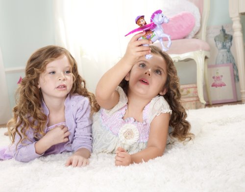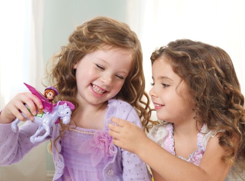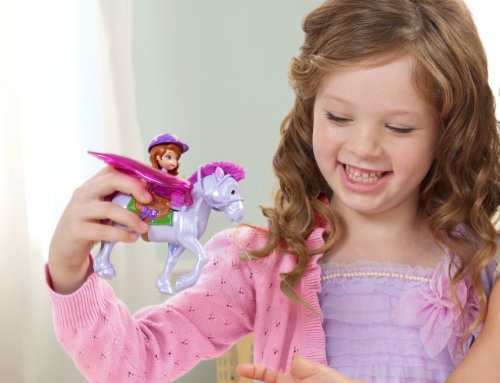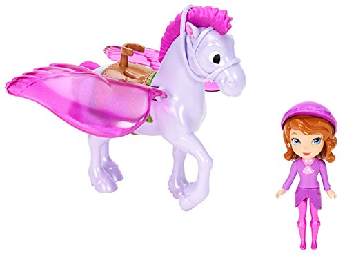 Disney Sofia the First and Minimus: Now that she's a princess, Sofia must adapt to an extraordinary life of royalty and learn how to be a princess-inside and out! That means rising to new challenges and opportunities, like trying out for the flying Royal Derby team. Fans of the Disney Junior series will love reenacting favorite scenes or imagining new ones for Sofia and her adorable flying horse, Minimus. Sofia doll is articulated at the waist to allow her to sit and ride her beloved Minimus through the sky. When girls clip the Sofia 3-inch small doll into the saddle on the back of her adorable horse and then move him up and down, his wings will pop up and flutter as the pair "flies" through the air. It's a magical moment that girls will delight in playing out over and over again. Sofia doll looks adorably sophisticated in her pink and purple riding outfit with matching helmet. Minimus horse enchants with his pink molded mane, big eyes and enchanting wings.Feature