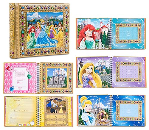 Celebrate the opening of the Magic Kingdoms New Fantasyland with this all new Deluxe Princess Autograph book and photo album. Your little princess will love this beautiful new golden jeweled look souviner book. Fill up the pages of this with autographs and photos of her favorite new Disney friends! This all new Princess Autograph Book is a royal choice to hold magical memories of Walt Disney World from the new Fantasyland. Holds all your princess autographs, Photos & Treasures. Hardcover encased spiral. Makes for a stunning Christmas gift. Since all of these are sealed, we do not know or have information on how many pictures it will hold or the size of photos that can be added. The Book itself measures 10 x 7 1/2