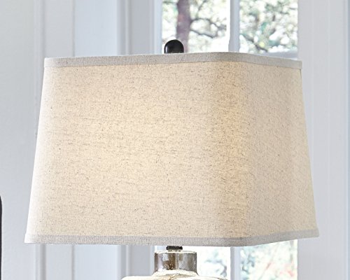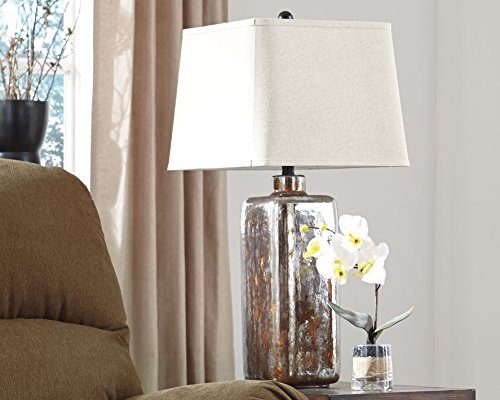 GLASS BASE: Made of mercury glass in a square shape with soft, rounded corners. Topped with a similarly square fabric hardback shade
