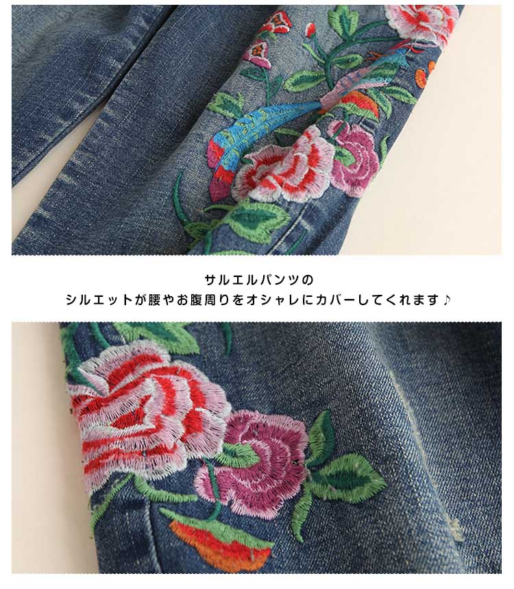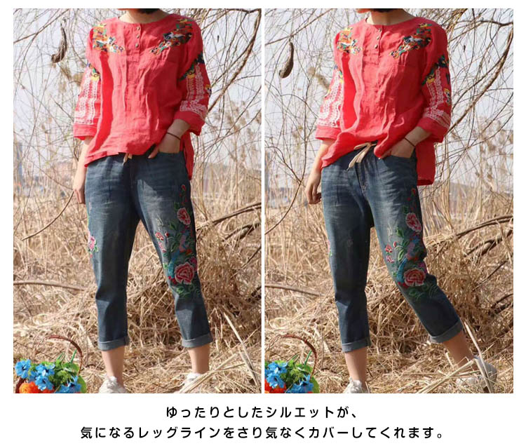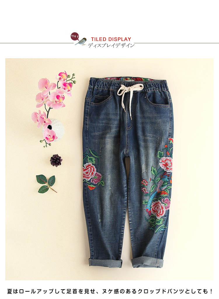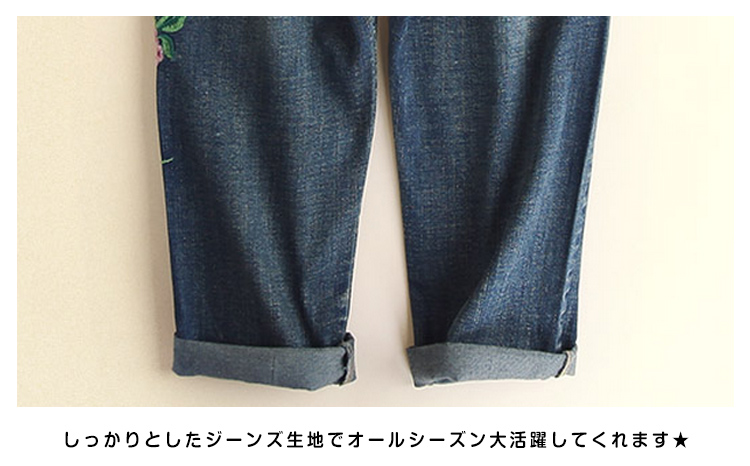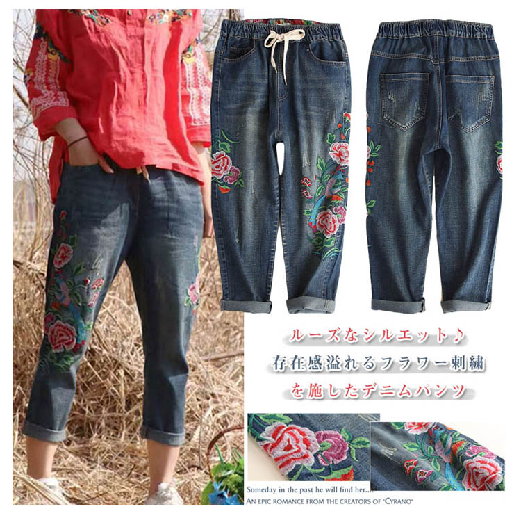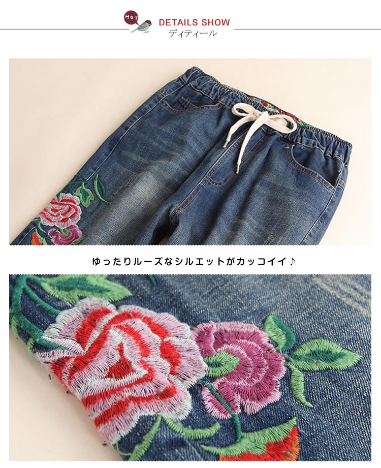 | ルーズなシルエット♪存在感溢れるフラワー刺繍を施したデニムパンツ。ウエストは穿きやすいゴム使用になっているので、見た目以上に楽ちんに穿けるのも嬉しいポイント! ゆったりとしたシルエットが、気になるレッグラインをさり気なくカバーしてくれます。夏はロールアップして足首を見せ、ヌケ感のあるクロップドパンツとしても! | |
