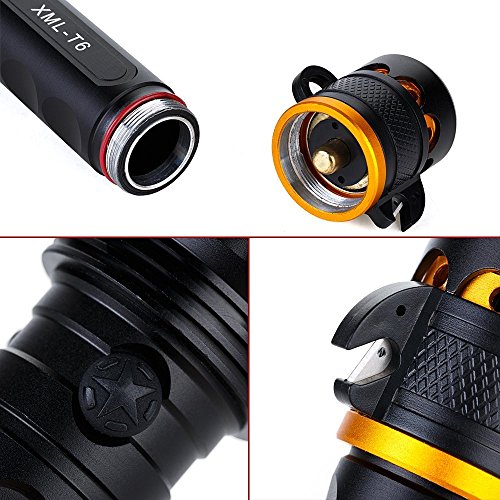 -. Feature : Prosvet Tactical Flashlight CREE XML T6 LED can come to 1200Lumens / Self DEFENCE & 4 Diamond attack heads, can break the window in an emergency situation / Tail Audible Alarm(light touch the Red Police Button for Emergency alarm, blade at flashlight button side, can easily cut off ropes in gloves / 5 switch modes LED flashlight : high / middle / low / strobe / sos / Hard-Anodized finish; shock-proof; waterproof;Camping Lantern