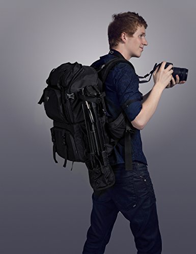 -. Feature : 一眼レフカメラ本体2台、レンズ6-8本まで収納可能の大容量のバックパック。 / 三脚を取り付けて運ぶために調整可能なストラップ(バッグの上とバックの左右に)とホルダー(底部に)を装備。 / 身長に合わせて長さ調節可能なショルダーストラップとウエストベルトを装備。 / 背面にはバックルをとめるとスーツケースのキャリーバー(持ち手部分)に通して装着することができるので、身体に負担をかけずにサクサク移動できます。 / 中の仕切りはマジックテープで好きなところに付け替え可能で、レンズの長さやボディの大きさなどの変化に も対応できる。内部の仕切りを外すことで、二気室バッグから一気室バッグへ切替えられる二気室貫通構造。