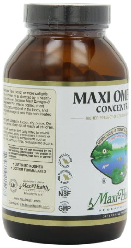 -. Binding : Health and Beauty -. Brand : Maxi-Health -. Feature : 180 enteric, No Burb Soft Gels / PURE and potent fish oil from anchovies, supplying you with 620 mg of EPA (Eicosapentaenoic Acid) and 420 mg of DHA (Docosahexaenoic Acid) per serving / GLUTEN Free, No Artificial Flavors, Colorings or Preservatives. Kosher Certified / SAFE: Made in the USA, Manufactured in a NSF & FDA registered and GMP Certified Facility : MaxiHealth Was Established in 1974 -. Label : Maxi -. Manufacturer : Maxi -. MPN : 753406215188 -. PartNumber : 753406215188 -. ProductGroup : Health and Beauty -. ProductTypeName : HEALTH_PERSONAL_CARE -. Publisher : Maxi -. Studio : Maxi -. Title : Maxi-Omega-3 concentrate Certified Kosher Fish Oil, 1200-Capsules