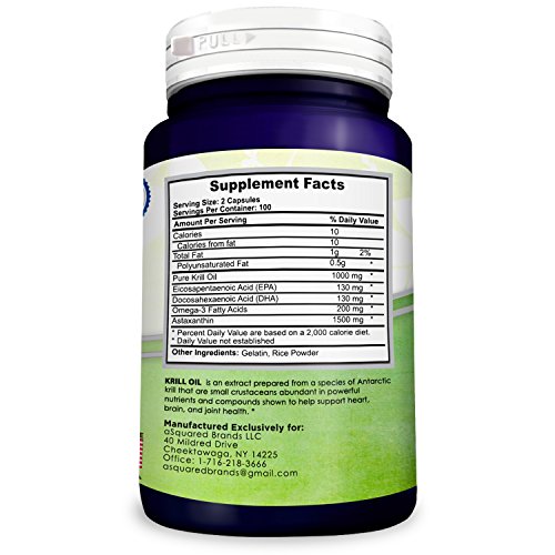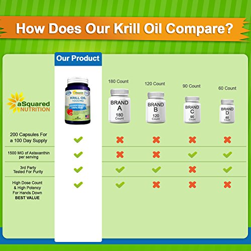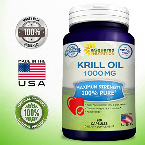 -. Binding : Health and Beauty -. Brand : aSquared Nutrition -. EAN : 0638170999840 -. Feature : 100% PURE HIGHEST QUALITY KRILL OIL + OMEGA 3 ANTIOXIDANT BLEND - Our product delivers 1000mg Per Serving of pure, high quality, 100% purified, mercury free, gluten free, solvent free, and GMO free Krill Oil blend. Moreover, our complex contains antioxidant Astaxanthnin that provides essential nutrients for the skin, eyes, and cells. Sourced from Euphausia Superba / BEST VALUE ON AMAZON - 200 CAPSULES AND 100 DAY SUPPLY - You receive 200 capsules for a FULL 60 day supply (others offer half for a more expensive price), all backed by our "best in the industry" 100% MONEY BACK GUARANTEE. / SUPPORTS HEART, BRAIN, JOINT, and IMMUNE SYSTEM HEALTH - plus our Krill Oil blend supports skin and eye health. 100% Pure! 100% Premium! / NATURAL FORMULATION: No fillers, binders, or potentially harmful preservatives or GMOs means no unwanted side effects for you! We go the extra mile to ensure our supplements have passed extensive quality control testing before being bottle and sold. We use only FDA regulated GMP certified manufacturing facilities in the USA. / NO FISHY AFTER TASTE: No More Fish Burps like you may get from other Fish Oil or other Omega 3 supplements. -. IsAdultProduct : 0 -. Label : aSquared Brands -. LegalDisclaimer : These Statements have not been evaluated by the Food and Drug Administration. This Product is not intended to diagnose, treat, cure or prevent any disease. -. Manufacturer : aSquared Brands -. PackageQuantity : 1 -. ProductGroup : Health and Beauty -. ProductTypeName : HEALTH_PERSONAL_CARE -. Publisher : aSquared Brands -. Studio : aSquared Brands -. Title : Pure Krill Oil 1000mg w/ Astaxanthin & Omega 3 xl (200 Capsule Supplements) Antarctic Sourced Rich in DHA & EPA & Phospholipids, Compare to Omega 3 6 9 Fish Oil Fatty Acids, 100% Purified No Mercury -. UPC : 638170999840