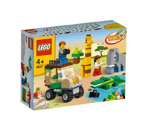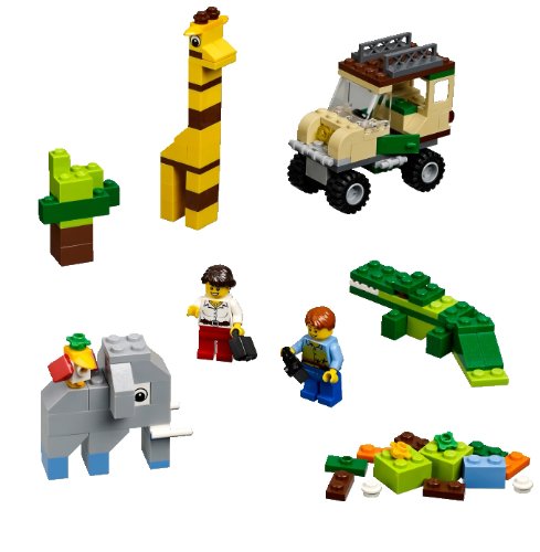 Let's play with crocodile set, crocodile, elephant, giraffe, birds and car etc. Lego basic set and mini figure of man and woman with simple idea leaflet.
