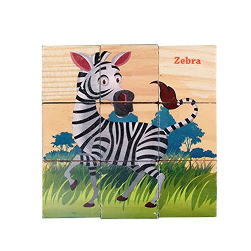 9 cubes wood puzzle for toddlers. Size: 4" x 4" x 1.5", Ages for 3 and up. Each wooden block puzzle creates 6 different images of wild animals. Colorful preschool puzzles improve toddlers' colors identify ability. The educational puzzle toy promotes hand-eye coordination and matching skills.