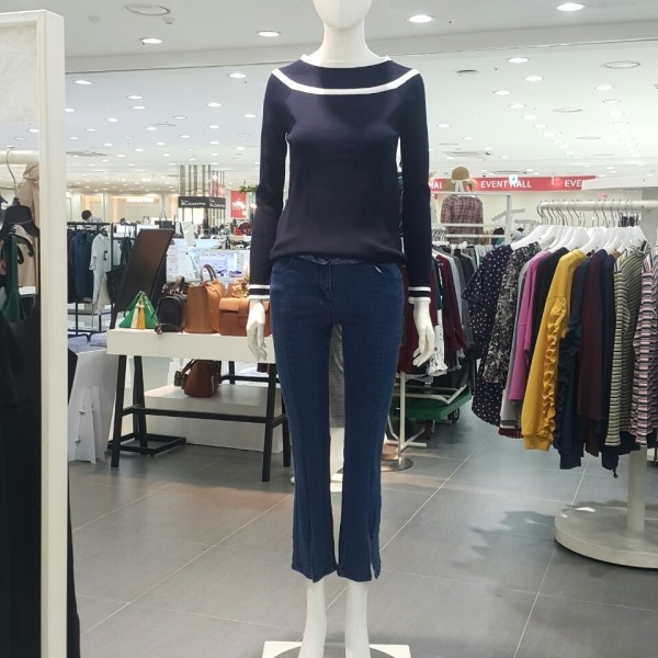 깔끔한 니트에 색깔이 배색된 오프숄더형 니트티셔츠입니다