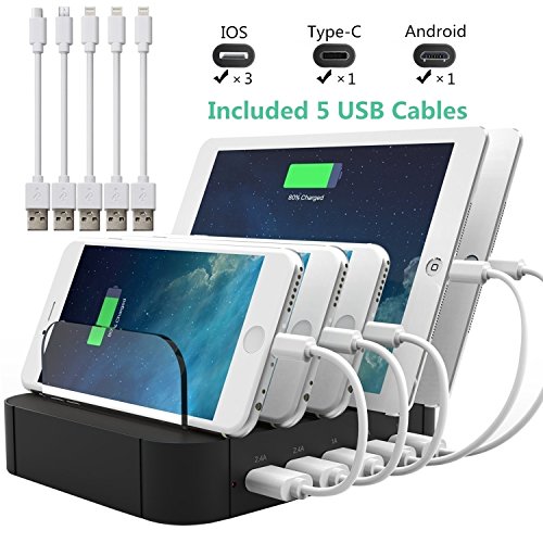 -. Feature : 5 USB CABLES, DOCK STATION and CHARGER in ONE - MOLAER provides one-stop charging solution for multiple devices charging task. This compact charging station works smoothly with any USB-powered device such as Apple iPhone, iPad and Android smartphones, tablets. Note that, the 5 short USB charging cables displayed in the pictures are included in the package. 3 for IOS, 1 for Android and 1 for type C.You do not need to buy USB charging cables separately. / FAST and SMART CHARGING - This multiple 5-Port USB charger stand (2 x 2.4A +3 x 1A) has two high-power 2.4A fast charging ports for power-hungry devices like tablets and large smartphones. With smart IC installed, the USB hub can automatically identify your devices and deliver up to 6A from all 5 ports collectively. / TIDY and ORGANIZED - No more cluttered cables. You do not have to plug a bunch of chargers on your power outlet for every phone and tablet you have. MOLAER electronics charging station keeps all devices in one place - nice and clean. / INNOVATIVE REMOVABLE BAFFLE DESIGN - MOLAER detachable Charging Station that baffles and base can be effortlessly separated. Just choose which baffle be left then you have enough space to fiddle with the posture of your devices, lying flat or sideways to charge. It can save a lot of space and is easy to carry on the go. Include 8 baffles, 2 more for back up, in case you break it. / ABSOLUTE SAFETY and PROTECTION - MOLAER's Charging station owns Cutting-edge circuitry and protects against short-circuit, over-voltage, over current, over-charge and travels friendly input voltage range of 100 - 240 volts. Built-in 100% Premium Copper Wire with FCC,CE Certified.