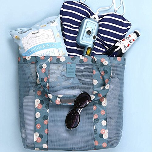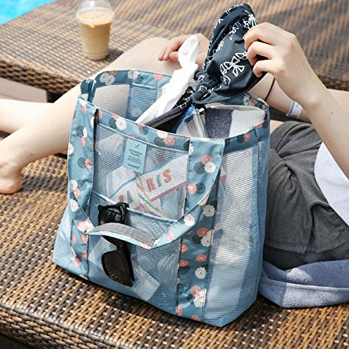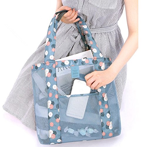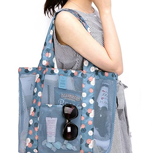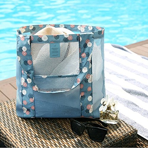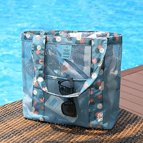 FGN beach bag, mesh beach tote bag pool handbag with pocket for women,kids toys (Blue)