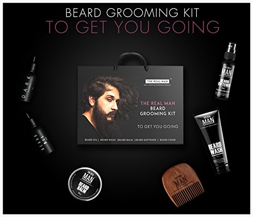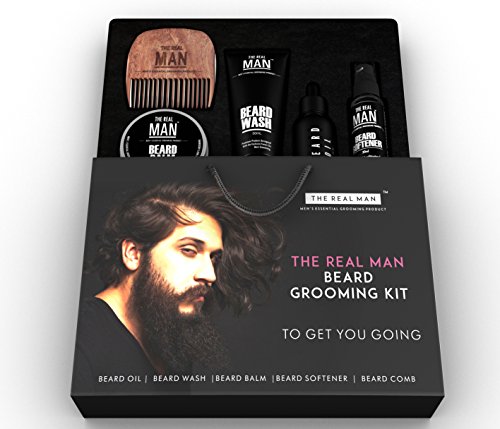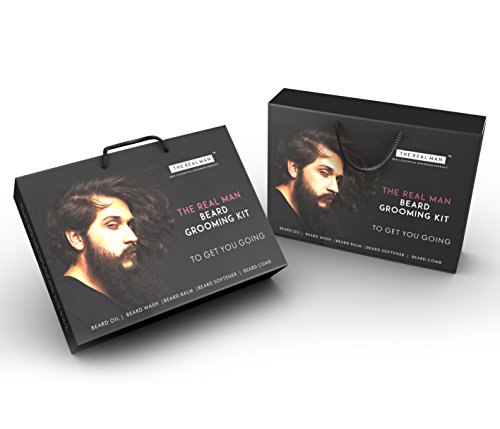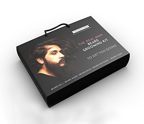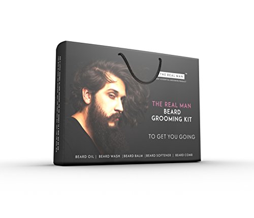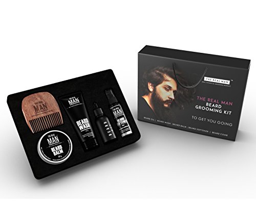 Essential Beard Grooming Kit By THE REAL MAN. A Beard Oil(1.01oz), Wash(1.69oz), Softener(1.01oz), Balm(50g) & Comb(25g) Set For Men. Especially...
