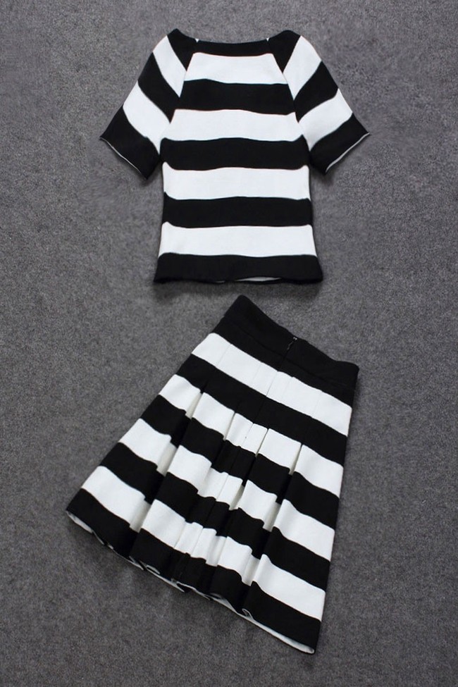 着回し◎★フロントジップアップ ストライプ 半袖 トップス&Aライン プリーツスカート セットアップ
