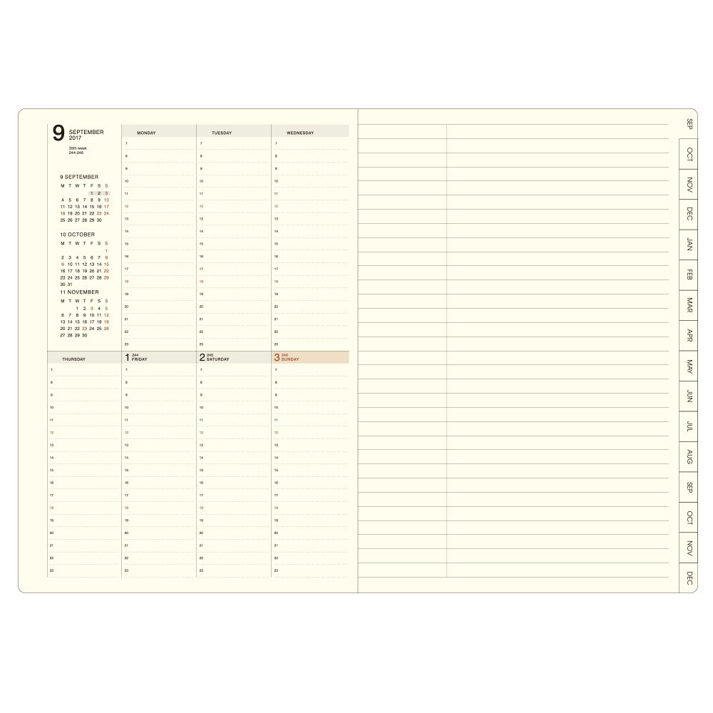 The contents are vertical one week vertical (the beginning of Monday · Saturdays and Sundays equally divided) on the left page, and the horizontal ruled note pace on the right page.